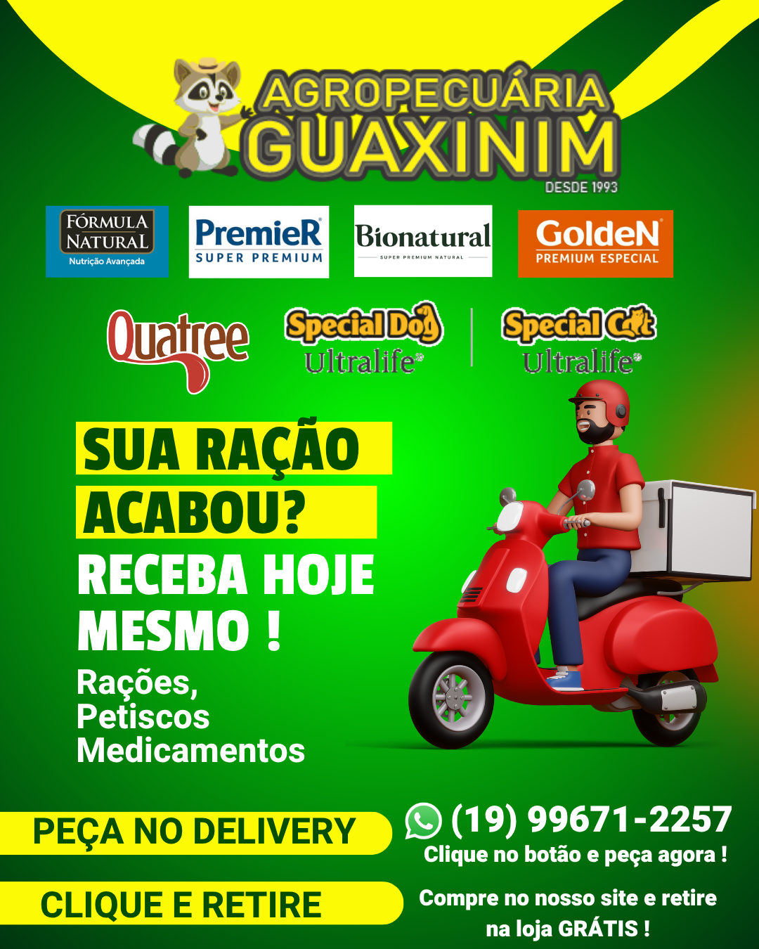 Comprar na Agro Guaxinim é sinônimo de rapidez e conveniência. Escolha a opção que melhor se encaixa no seu dia: